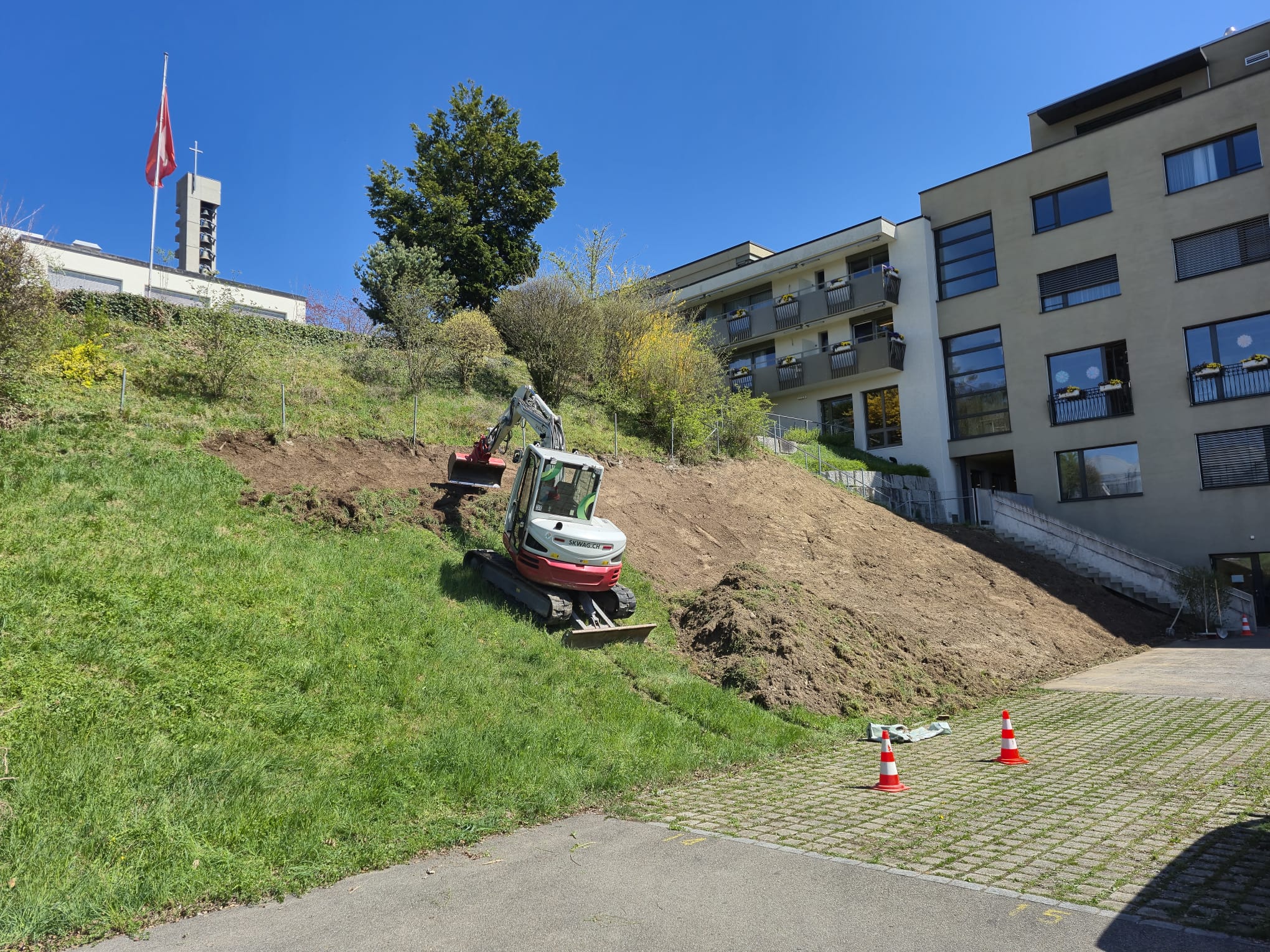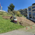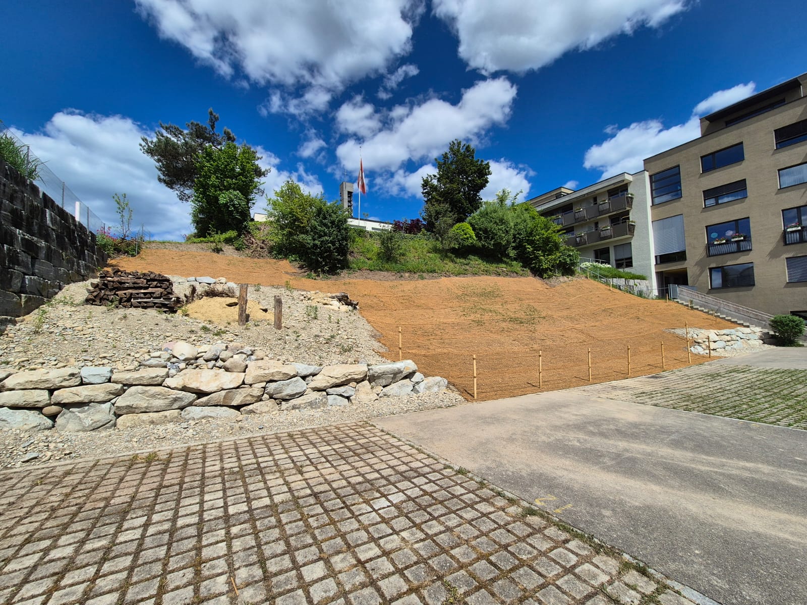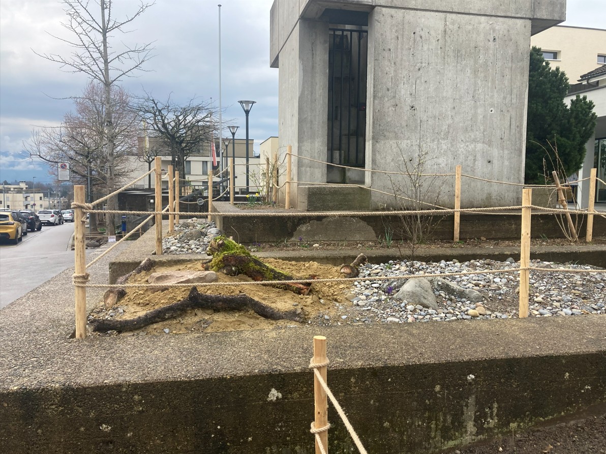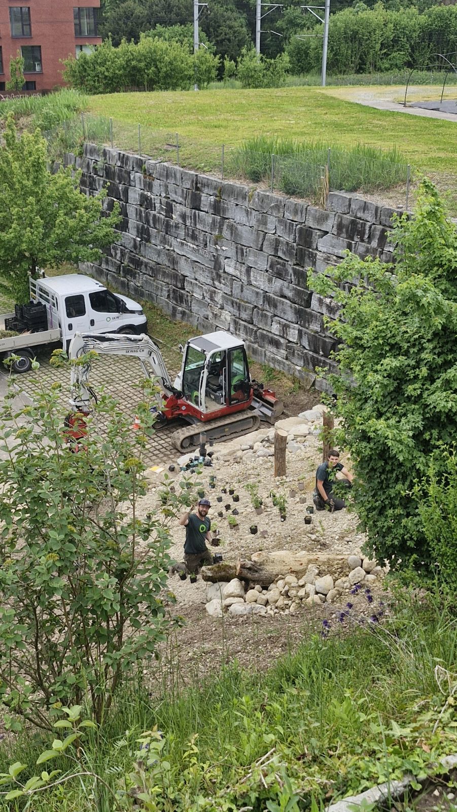 Ein grosses Bord mit viel ungenutztem Biodiversitätspotenzial konnten wir neu planen. Statt der vorher eher feissen Wiese sind nun Trockensteinmauern, Sandlinsen, Ruderalflächen, stehendes Totholz und auch eine grosse Totholzbeige wichtiges Habitat für Wildbienen, Eidechsen und andere Kleintiere. Die neue Magerwiese braucht noch eine Weile, aber auch die wird sich gut entwickeln. Die Umsetzung hat SKW Bubikon gemacht, den Auftrag hatten wir von der Katholischen Kirche Tann Rüti.